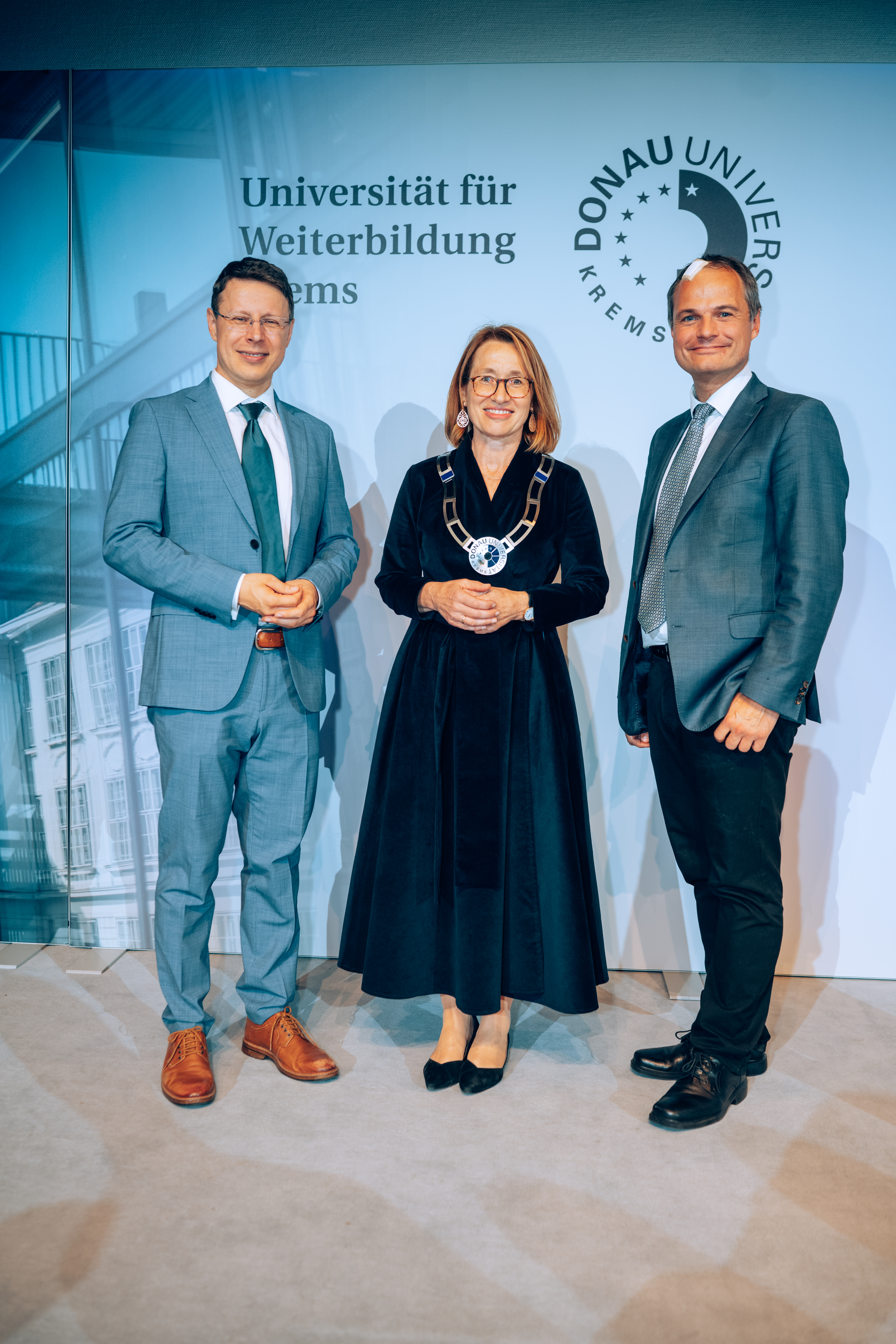 An ihrer Seite wirken Univ.-Prof. Dipl.-Ing. Dr. Stefan Oppl, MBA als Vizerektor für Lehre und Studierende sowie Univ.-Prof. Mag. Mag. Dr. Daniel Varro, LL.M. als Vizerektor für Finanzen und Nachhaltige Entwicklung. Gemeinsam repräsentiert das Rektorat Kontinuität und Erneuerung: Sie stehen für wissenschaftliche Exzellenz, praxisnahe Lehre und den Anspruch, die gesellschaftliche Wirksamkeit von Forschung und Weiterbildung weiter zu stärken.