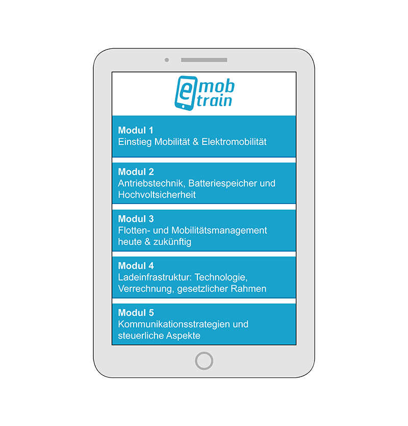 E-Mob-Train besteht aus fünf flexibel kombinierbaren Modulen. Die Module werden berufsbegleitend auf E-Learning-Basis angeboten, wodurch diese unabhängig von Zeit und Ort absolviert werden können.
