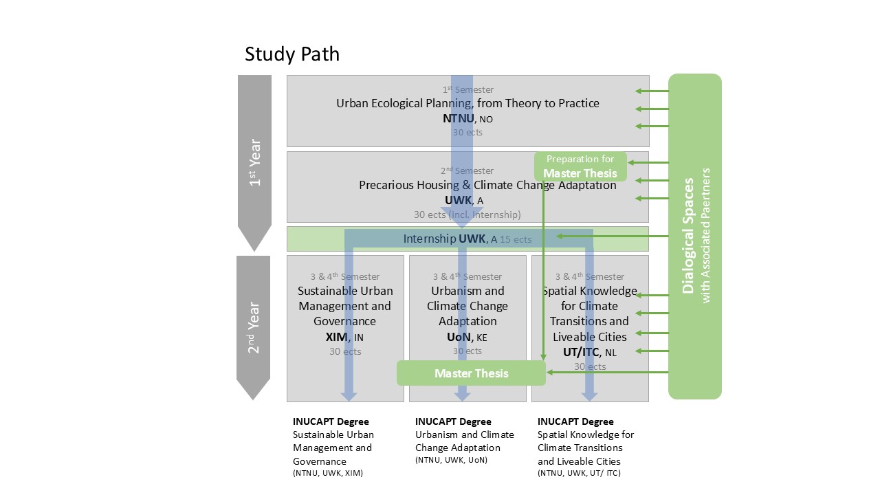 Specializations: students can choose between three specializations in the second year, 1st Track: Sustainable Urban Management and Governance, 2nd Track: Urbanism and Climate Change Adaptation, 3rd Track: Spatial Knowledge for Climate Transitions and Liveable Cities, specializations are provided by three universities in Europe, India and Kenya